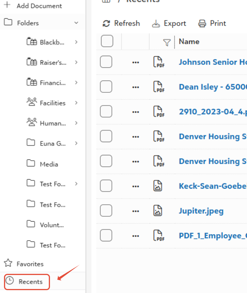 Recents automatically tracks and lists the last 20 recently accessed documents and folders for quick retrieval. Accessible from the portal home or sidebar, it helps resume work without searching.